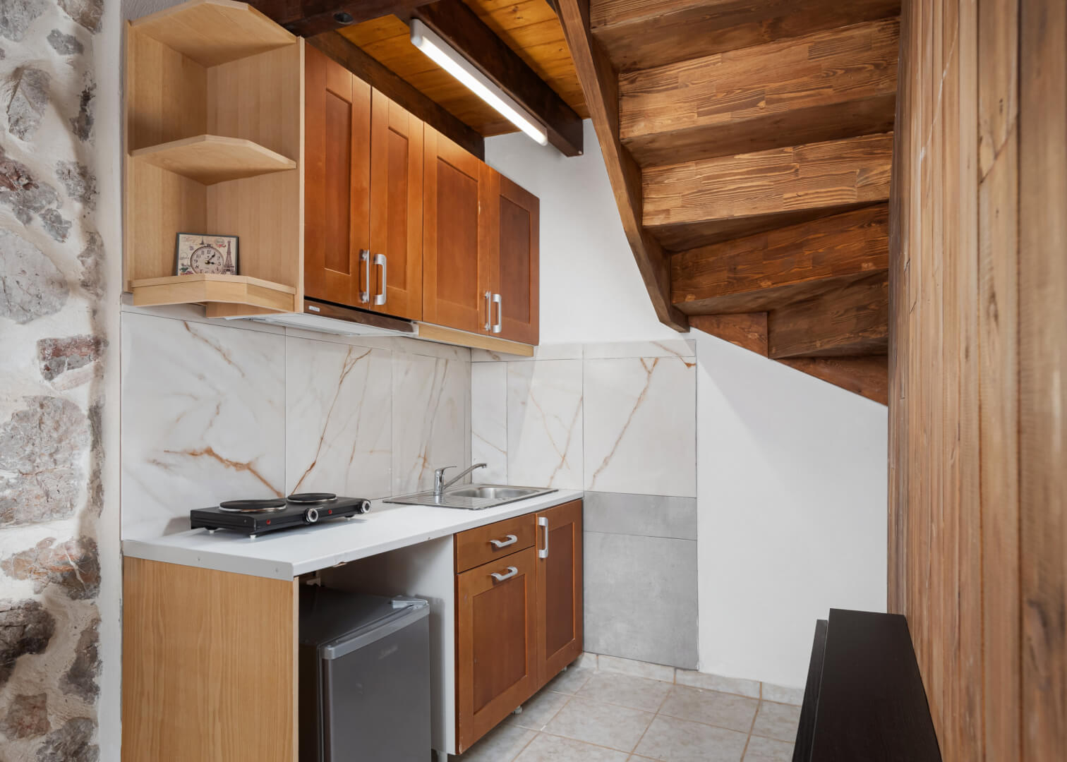 The chalet features a distinctive woodstone design throughout, adding a touch of natural elegance to every corner.Indulge in the comfort of the living room, where a cozy sofa bed and the indoor fireplace become the focal point, casting a gentle glow over the warm woodstone surroundings, complemented by its fully equipped kitchen, where culinary enthusiasts can prepare delightful meals to be enjoyed in the welcoming ambiance of the adjacent living room.