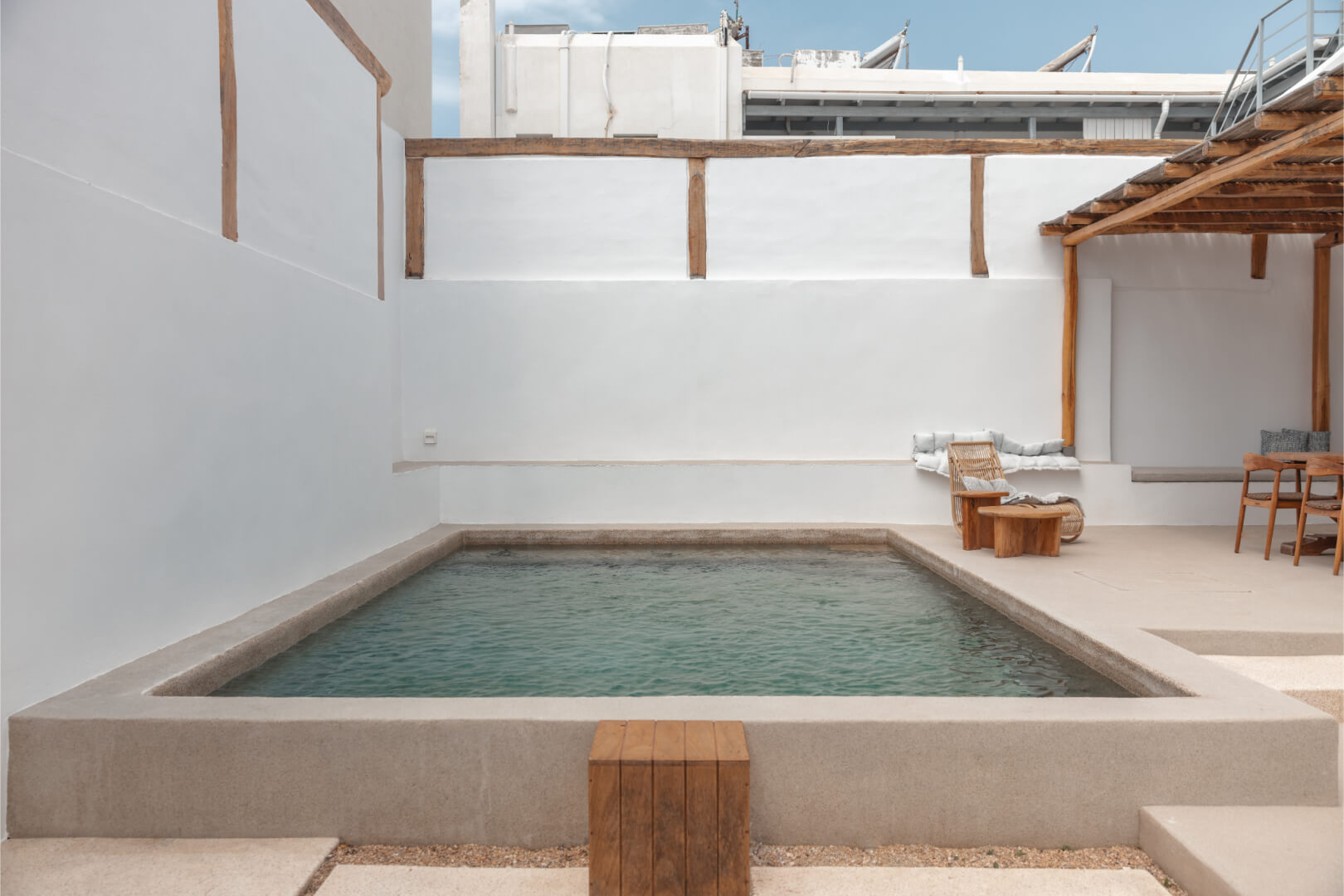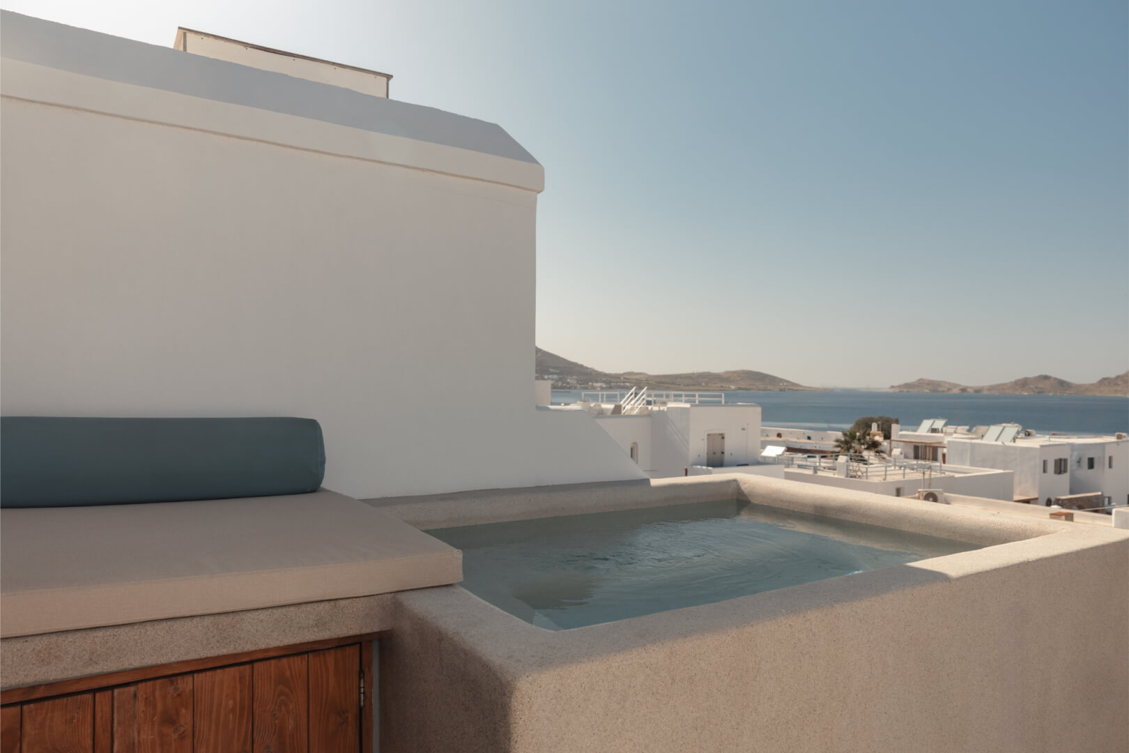 The exterior grounds are a true paradise. The ground level features a large, enclosed courtyard where guests can unwind on sunbeds beside a magnificent private swimming pool. An adjacent outdoor dining area provides the perfect setting for memorable meals under the Aegean sky. Ascend to the first floor, and you will discover another incredible private amenity: a smaller plunge pool located on a serene terrace. From this elevated position, guests can relax and soak in the breathtaking panoramic views of the Aegean Sea.