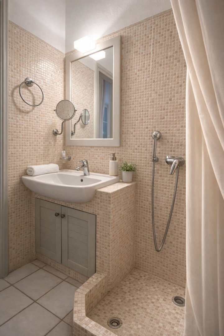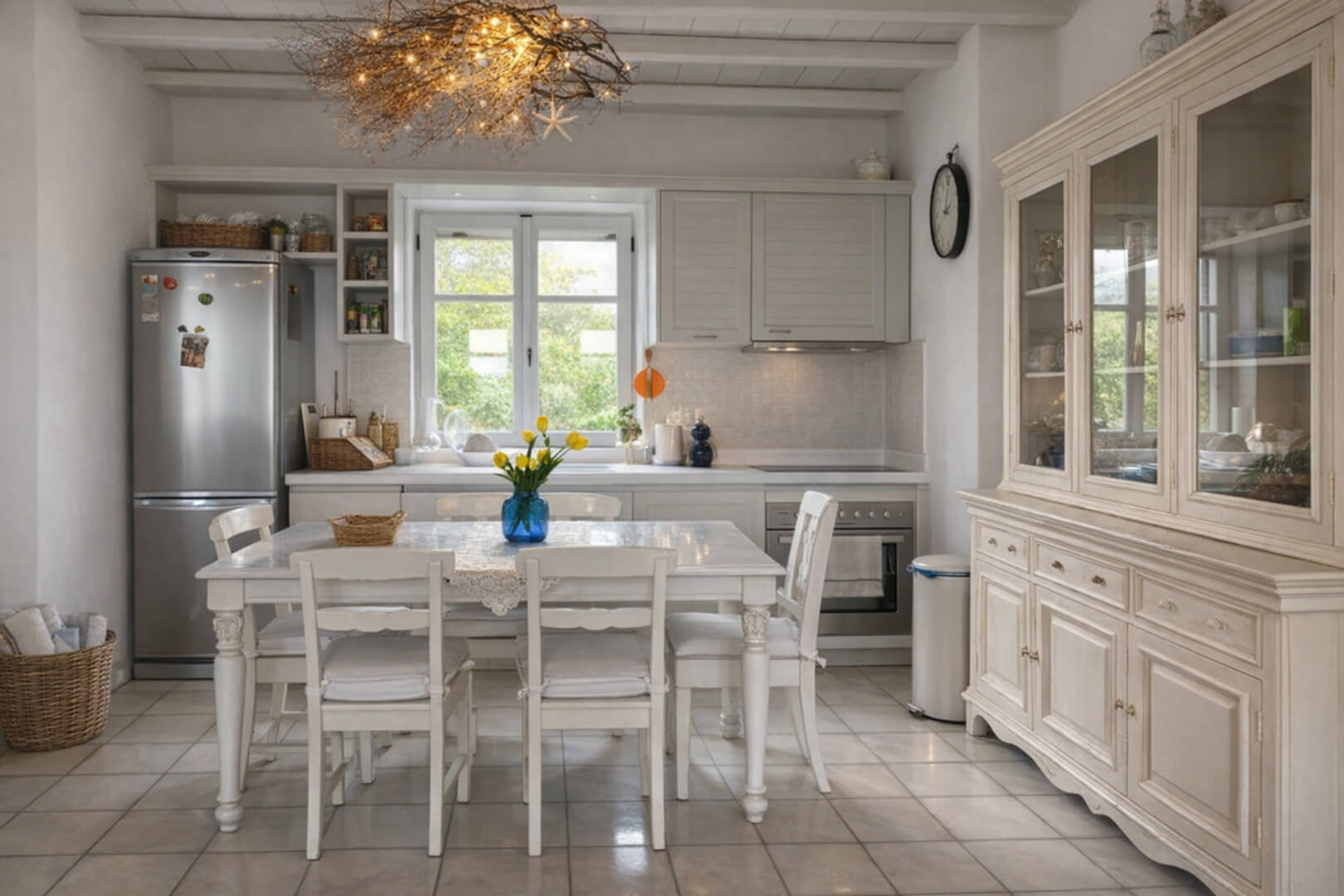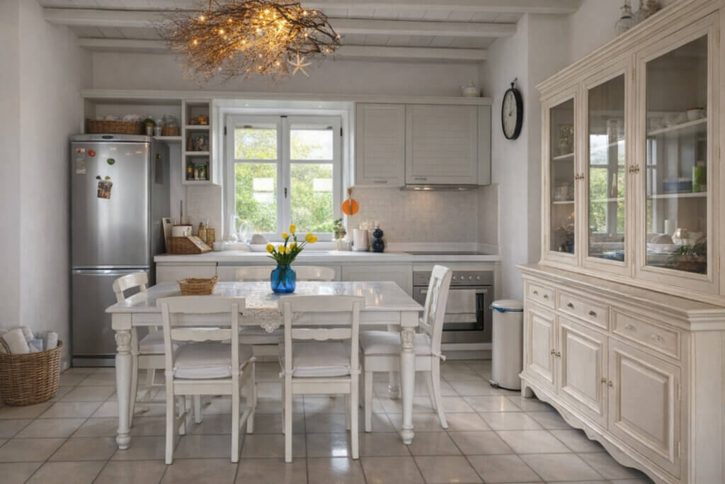 Inside, the villa features a bright and welcoming living room with a refined yet cozy ambiance, creating the perfect setting to relax after a day of exploring. The fully equipped kitchen, paired with a comfortable dining area, allows guests to prepare and enjoy meals with ease, whether it’s a casual breakfast or a leisurely dinner.