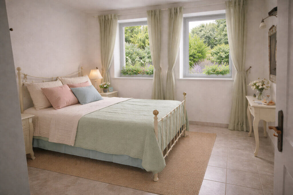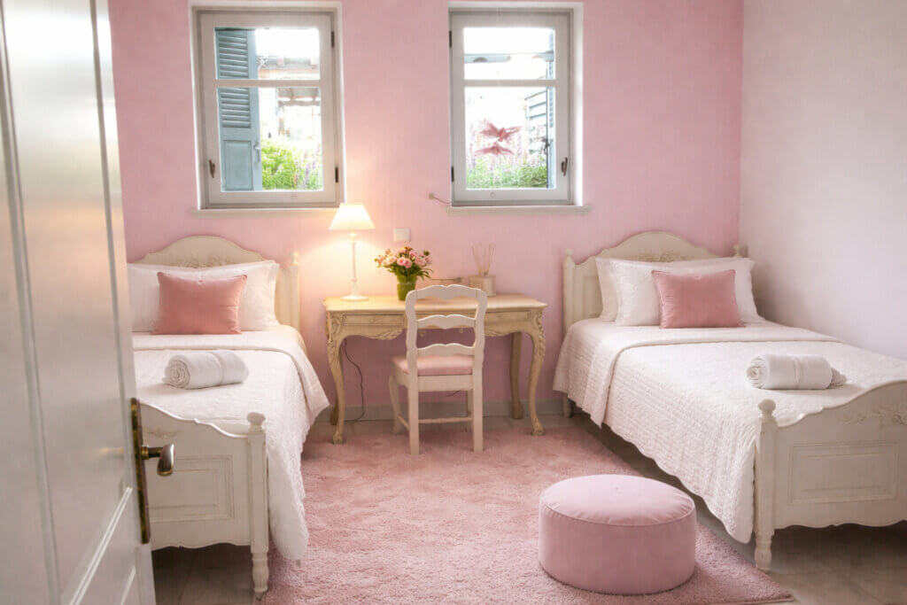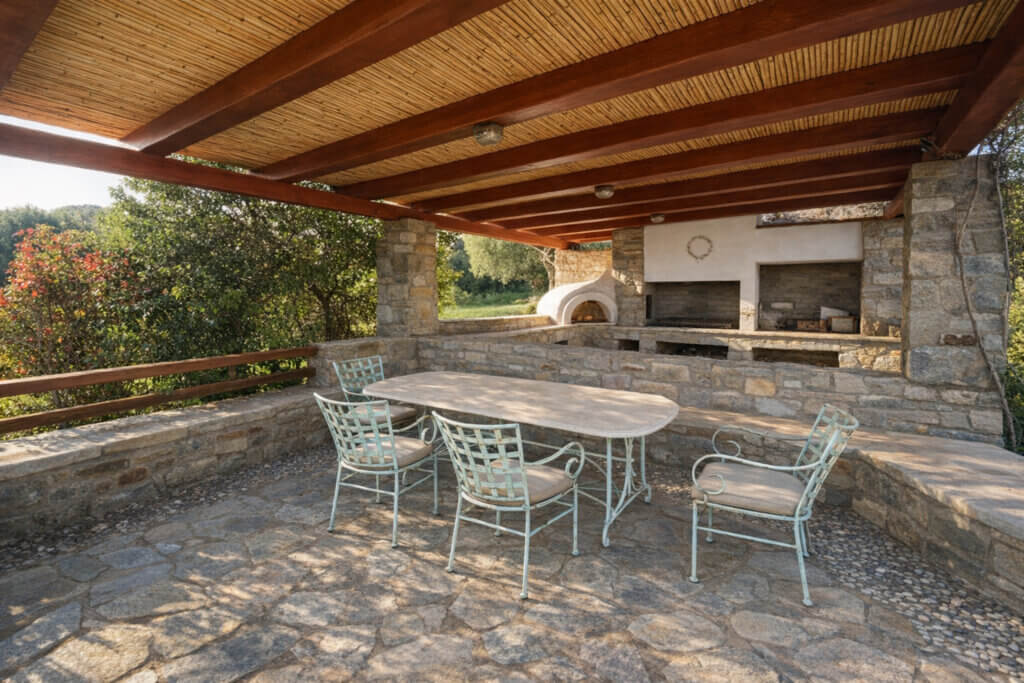 Outdoors, guests can unwind by the shared swimming pool, thoughtfully positioned at the edge of the villa to ensure quiet and privacy away from the main activity areas, or relax on the spacious patio surrounded by a lush garden that enhances the sense of tranquility. The outdoor setting is designed for comfort and enjoyment, featuring barbecue facilities and cozy spots to gather, share meals, and make the most of long summer evenings.